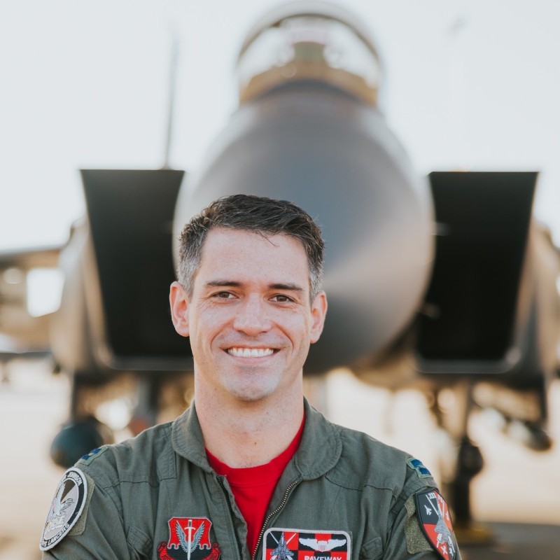 For Maj. Joseph “Paveway” Bledsoe ’11, leadership revolves around three main priorities: faith, family and being a fighter pilot. These guiding principles have taken him from his smalltown roots in rural Pennsylvania to the U.S. Air Force Academy and to flying the F-15E Strike Eagle. Although his family had no military background, he felt inspired to serve when his cousin graduated from the Academy in 2005. From middle school on, he was determined to pursue an appointment.